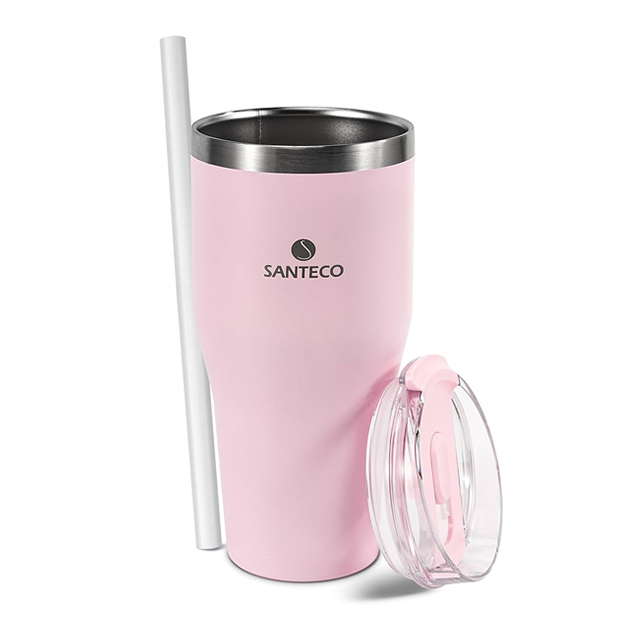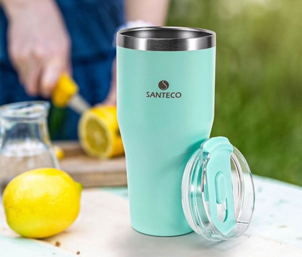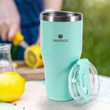 این ماگ سانتکو با حجم 590 میلی لیتر، مناسب ترین گزینه برای حمل نوشیدنی شما میباشد به این خاطر که کمپانی سانتکو بدنه لیوان را از فولاد ضد زنگ 18/8 تولید کرده تا مقاومت بالایی در برابر زنگ زدگی و ضربه داشته باشد. همچنین این ساختار کمک کرده تا درحین استفاده در طعم و بوی نوشیدنی تغییری ایجاد نگردد. درضمن درب این لیوان نیز با ساختار مقاوم در برابر نشت از جنس پلاستیک تریتان ساخته شده که توان بالایی در برابر ضربه و خش دارد؛ تریتان فاقد مواد شیمیایی مضر مانند BPA است که در حفظ سلامتی شما تاثیر بسزایی دارد.