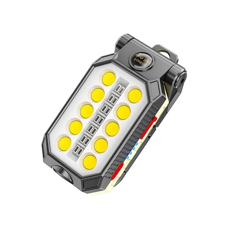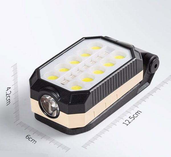 این محصول چراغی چندمنظوره و کاربردی با توان روشنایی 500 لومن است که با طراحی هوشمند و بدنهای مقاوم، انتخابی ایدهآل برای استفاده در فضای باز،کمپینگ،تعمیرات و مواقع اضطراری محسوب میشود.چراغ از مجموعه مجزا تشکیل شده ؛یک لامپ در جلو بهعنوان چراغقوه با لامپ پر قدرت T06 و 10 عدد چراغ COB و 14 عدد LED قرمز و آبی برای هشدارهای اضطراری.چراغ اصلی دارای 4 حالت نوردهی کم،متوسط، زیاد و چشمک زن پلیسی آبی و قرمز میباشد که 3 تا 4 ساعت کارکرد خواهد داشت.