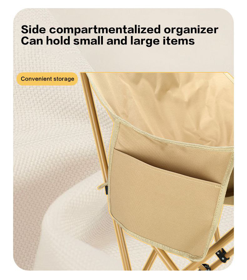 جنس بدنه این صندلی کمپینگ از پروفیل فولاد کربنی با قطر 16 میلیمتر بسیار بادوام است و مقاومت عالی در برابر خوردگی و زنگ زدگی دارد و همچنین هنگام نشستن تعادل کاملی بین راحتی و پشتیبانی کاربر ایجاد میکند. پارچه به کار رفته در صندلی و تکیه گاه از جنس پلیاستر آکسفورد 600D بوده که در برابر سایش،پارگی و آب مقاوم است و بافتی محکم و در عین حال نرم دارد و به دلیل داشتن منافذ ریز، ضد تعریق است و گردش هوا بهخوبی در آن جریان پیدا میکند.در ضمن یک جیب برای قرار دادن موبایل در کنار آن تعبیه شده است.